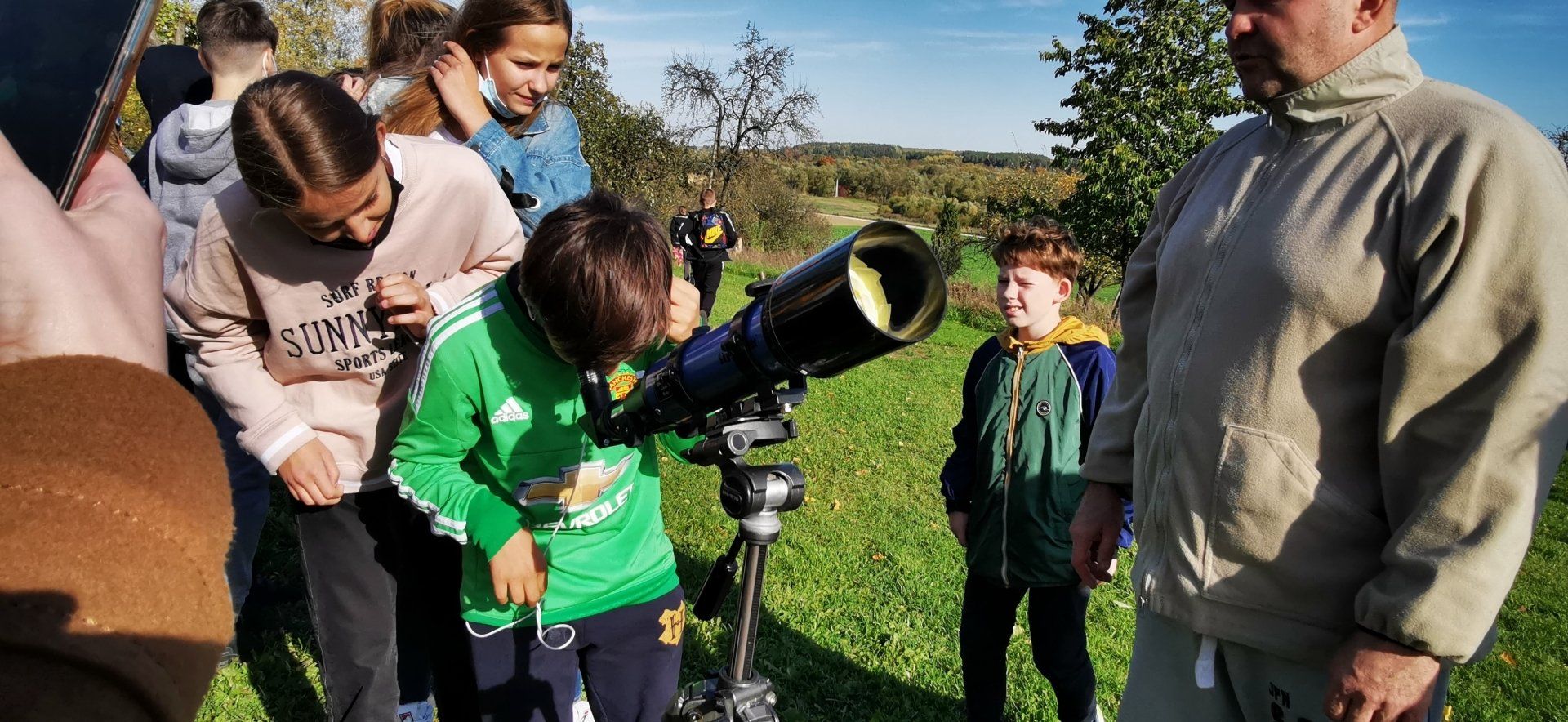Teleskopo pristatymas. Jo funkcijos ir galimybės. Ką galime stebėti šiuo teleskopu? Jei saulėta diena ir danguje nėra debesų, išėję į lauką arba per langą dienos metu stebėsime Saulę ir jos dėmes. Jei giedros nebus, nusitaikysime į pasirinktą tolimesnį objektą (bažnyčios bokštą, apšvietimo stulpą, aukštą medį su inkilu jame, didelę pušį su kankorėžiais ir pan.) Lyginsime, kuo vaizdas skiriasi per teleskopą ir plika akimi.